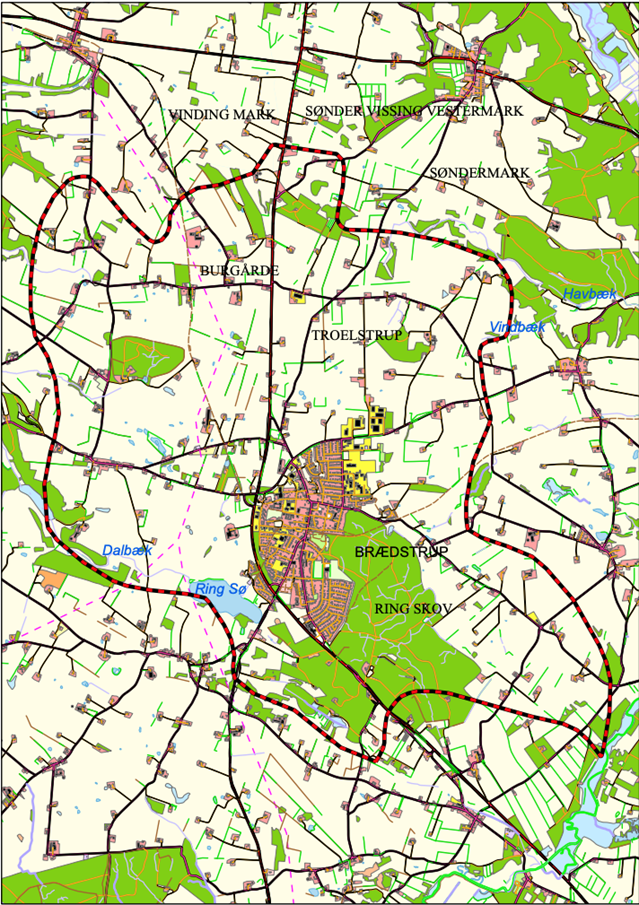 Kort over Brædstrup Vandværks forsyningsområde.